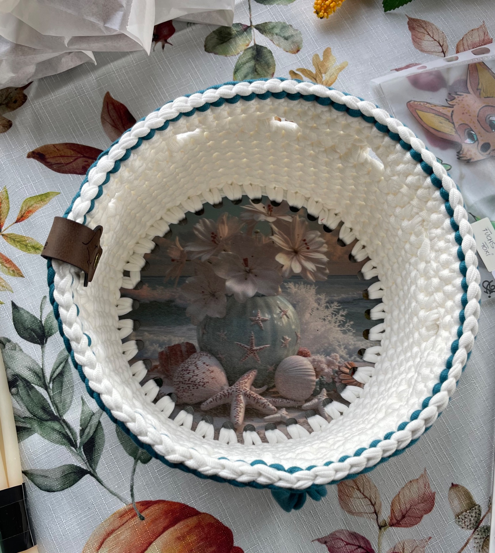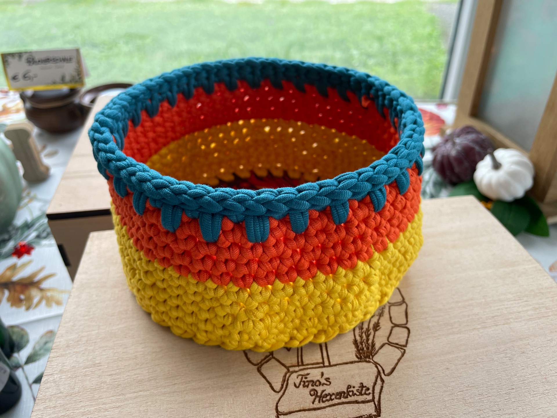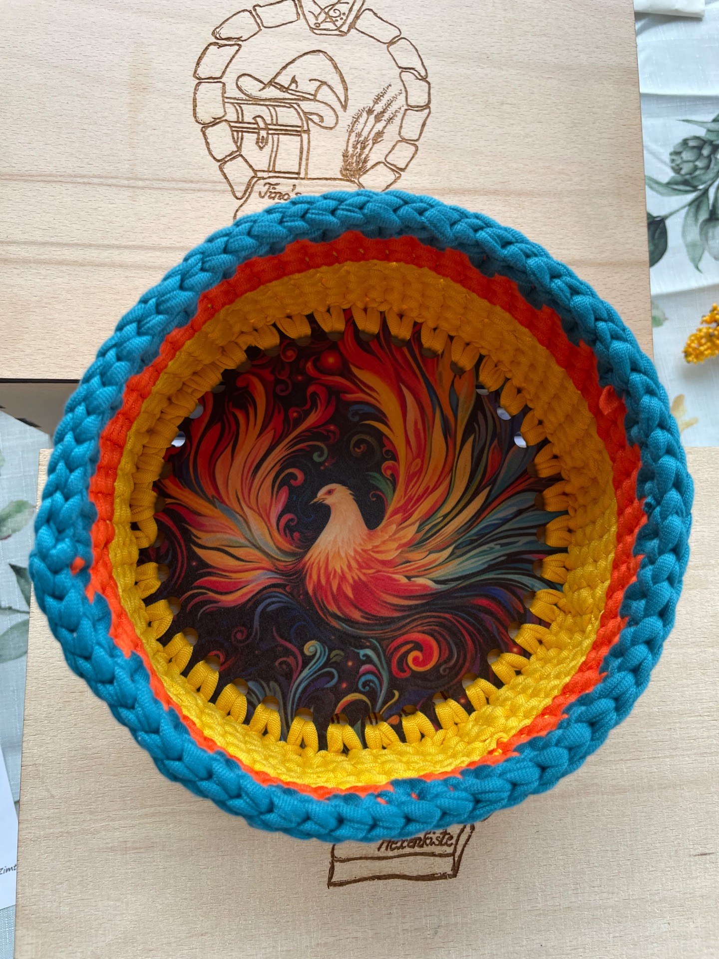 in verschiedenen Farb-Tönen und Motiven ist dieser wunderschöne Korb von mir auf einen Holzboden gehäkelt. Das jeweilige Motiv ist auf dem Boden aufgedruckt (Innenseite), außen ist der Boden natur und bildet mit dem Makramee-Garn / Baumwollgarn / elastischen Stoffband in unterschiedlichen Farben einen Hingucker als Geschenk oder für Dein Zuhause.