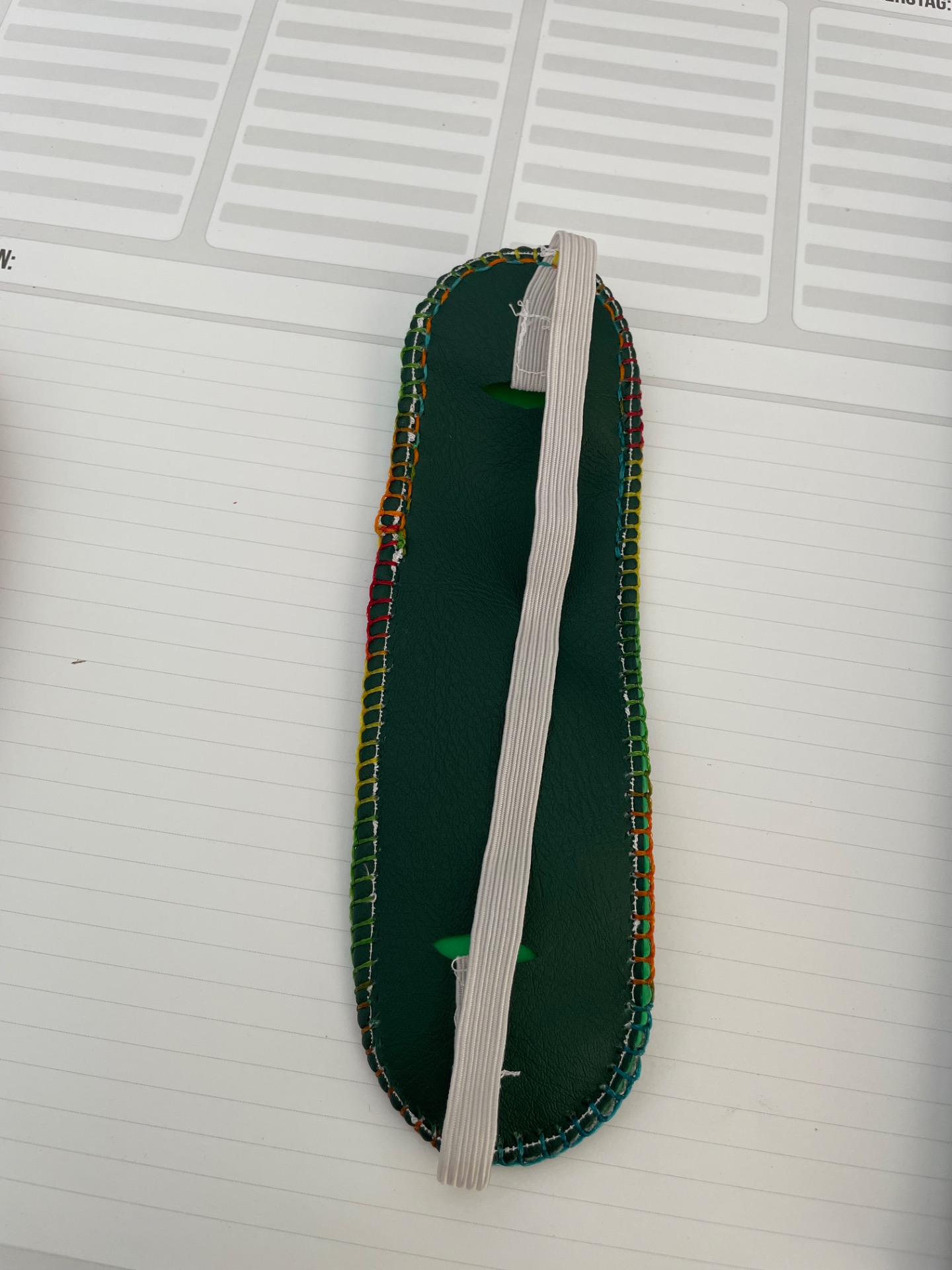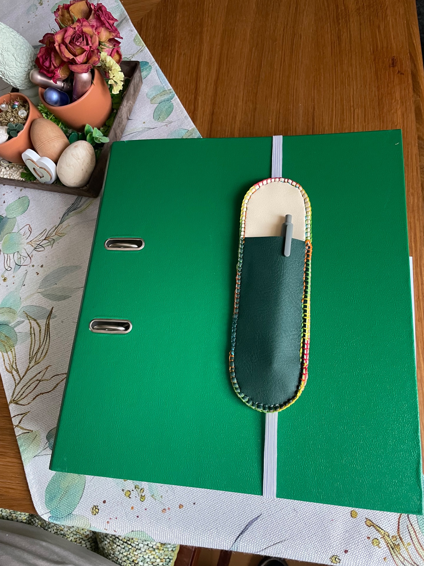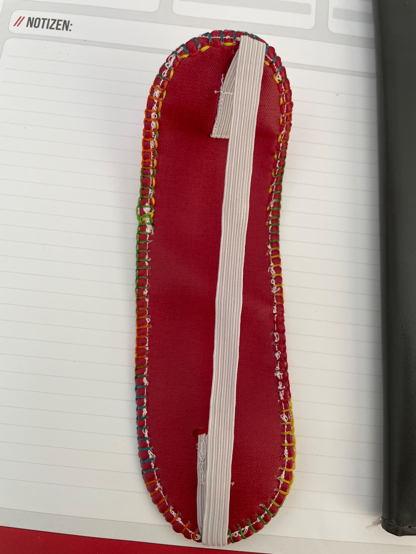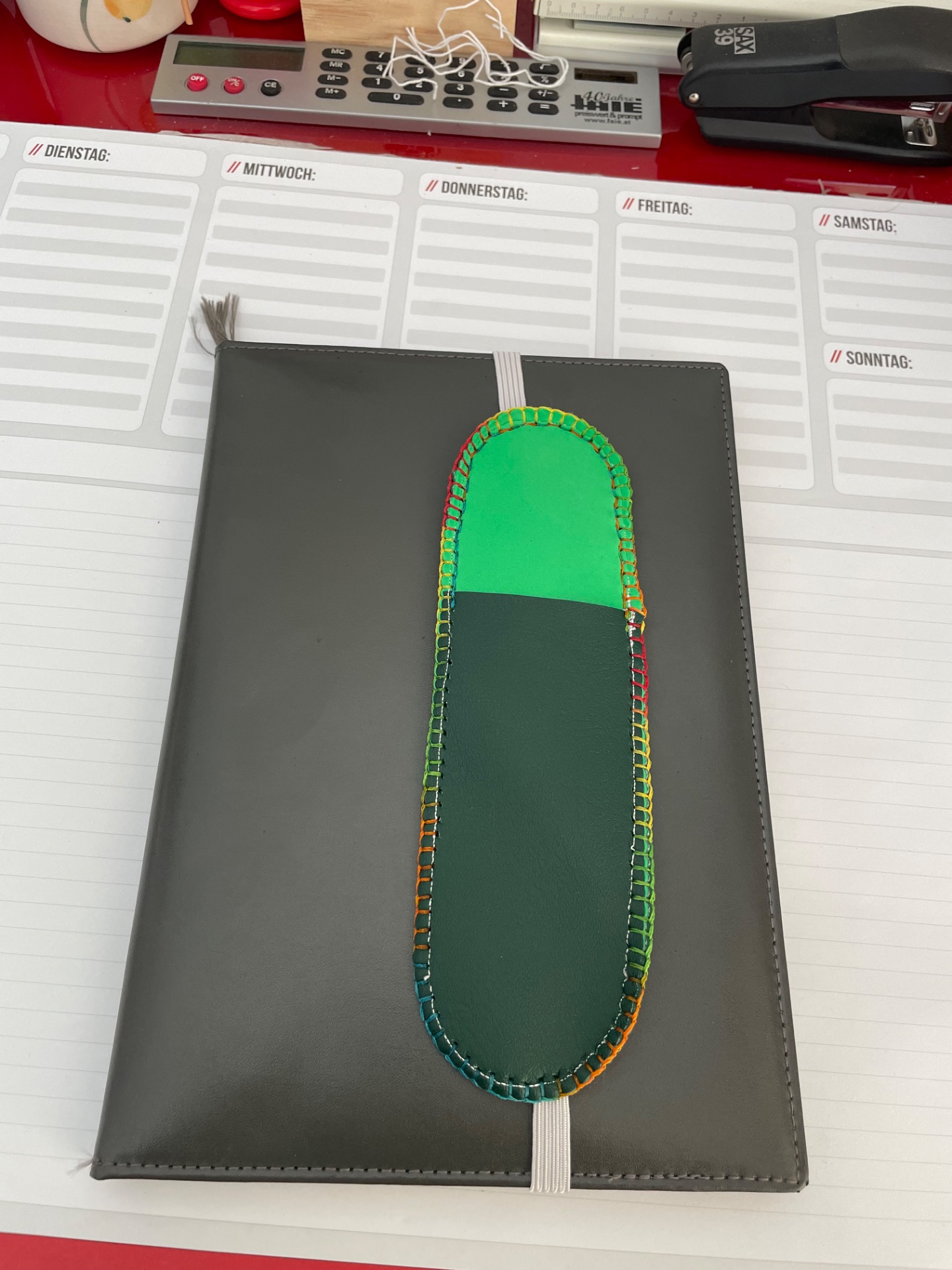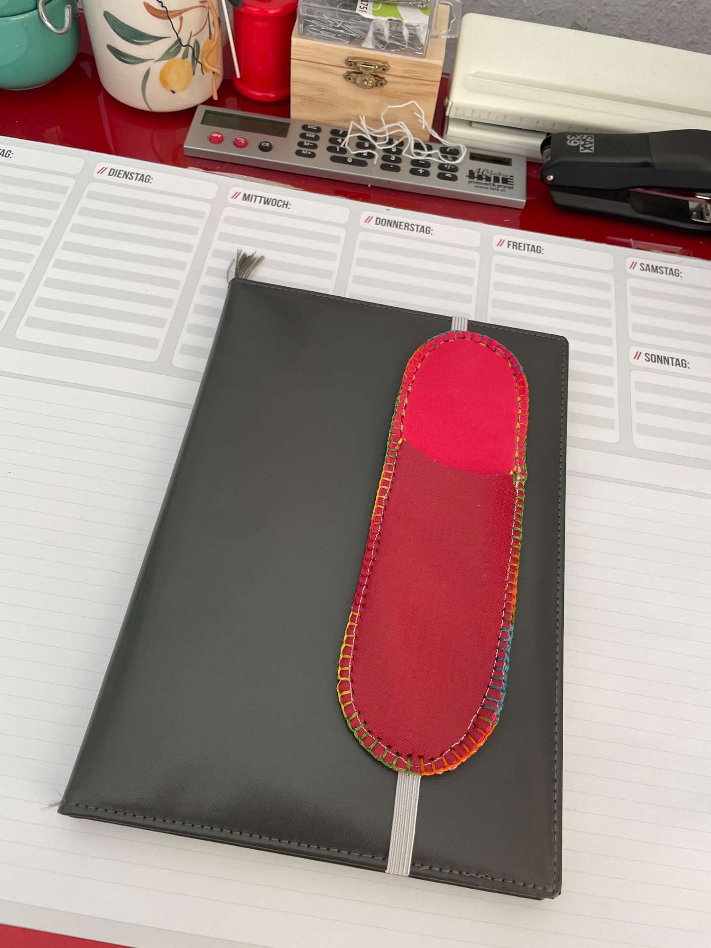 Mit einem Gummiband ausgestattet und einer schönen, farbenfrohen Hand-Ziernaht, kann man diesen tollen Stiftehalter auf jede Mappe (A4 + A5) oder Buch montieren. Schnell und einfach gewechselt hat man so immer bis zu drei Stift griffbereit ohne diese(n) zu verlieren oder eine lästige Tasche mitnehmen zu müssen.