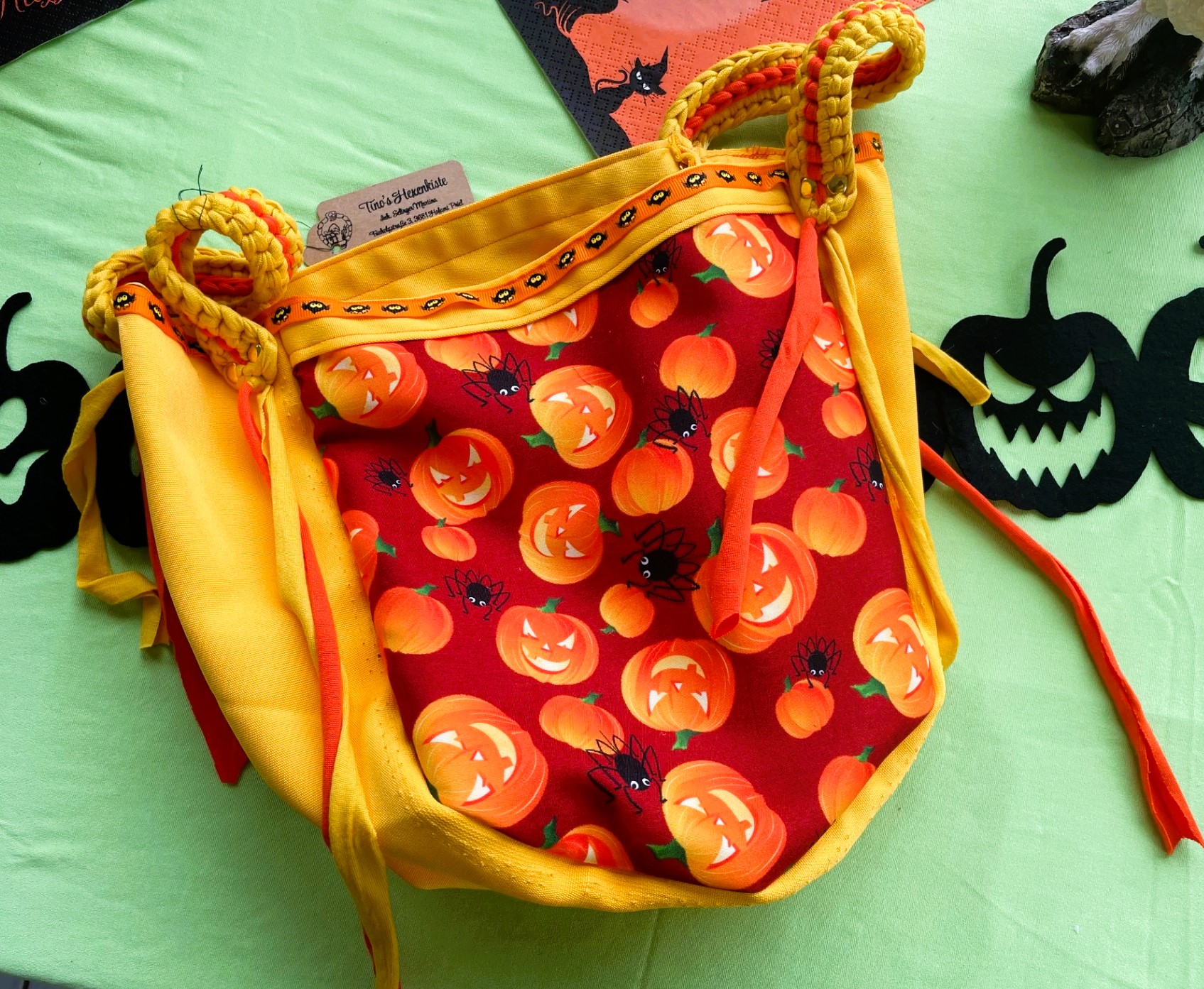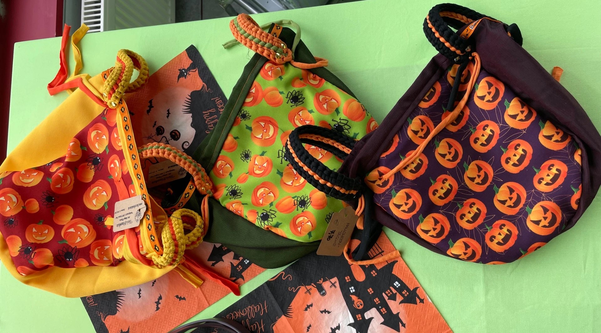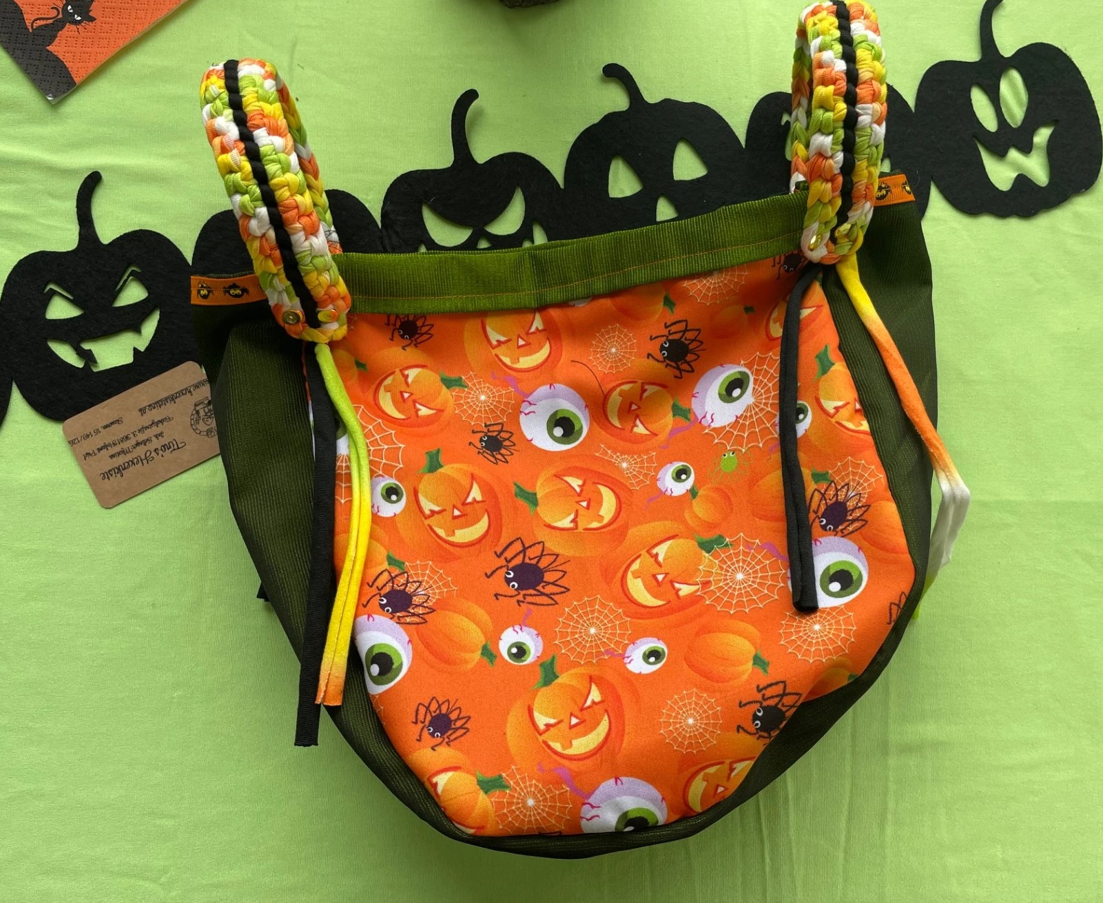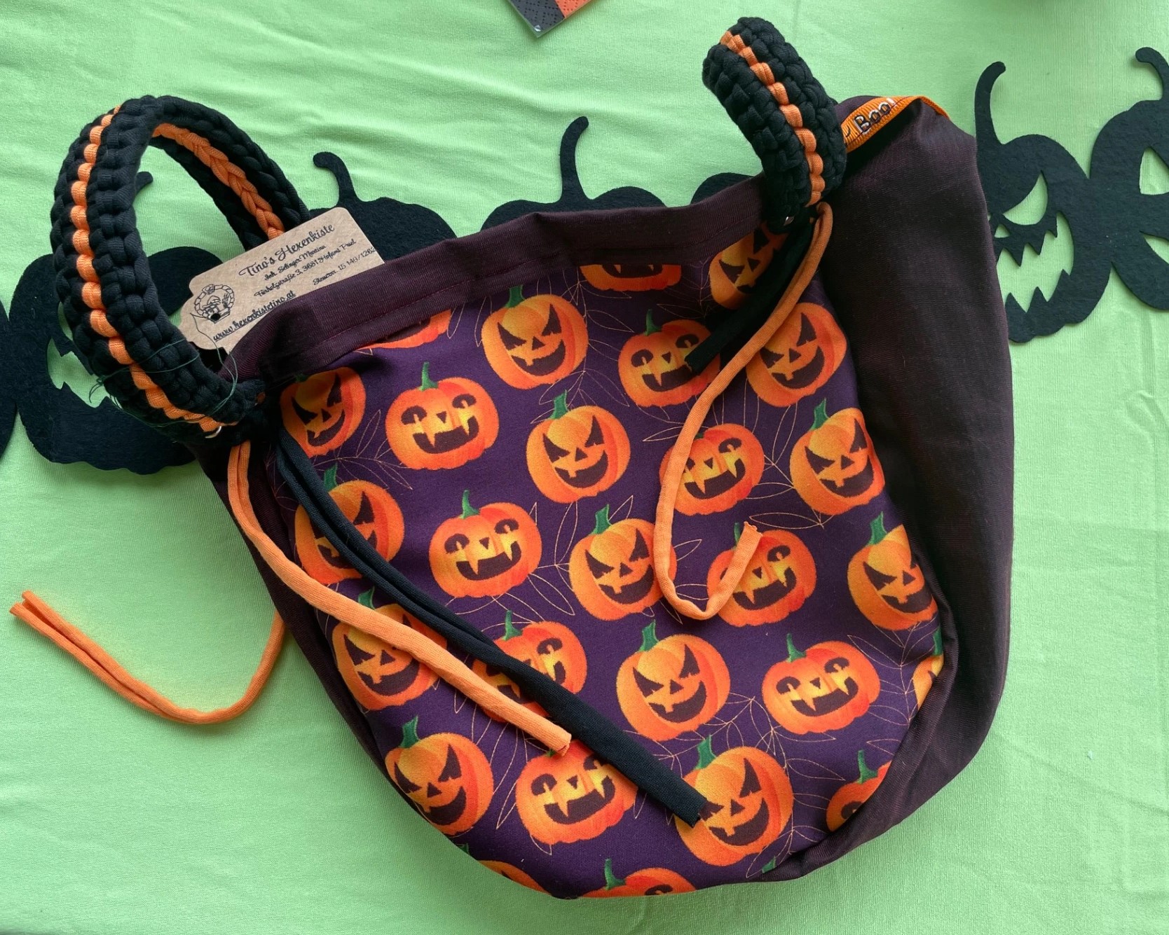Diese tollen Taschen sind von mir Handgefertigt und aus Stoff. Die Trageriemen wurden aus Stoffgarn gehäkelt und somit ist dieser Blickfänger auch waschbar. Optimal für Süßigkeiten sammeln gehen oder als Einkaufstasche im Herbst ;)