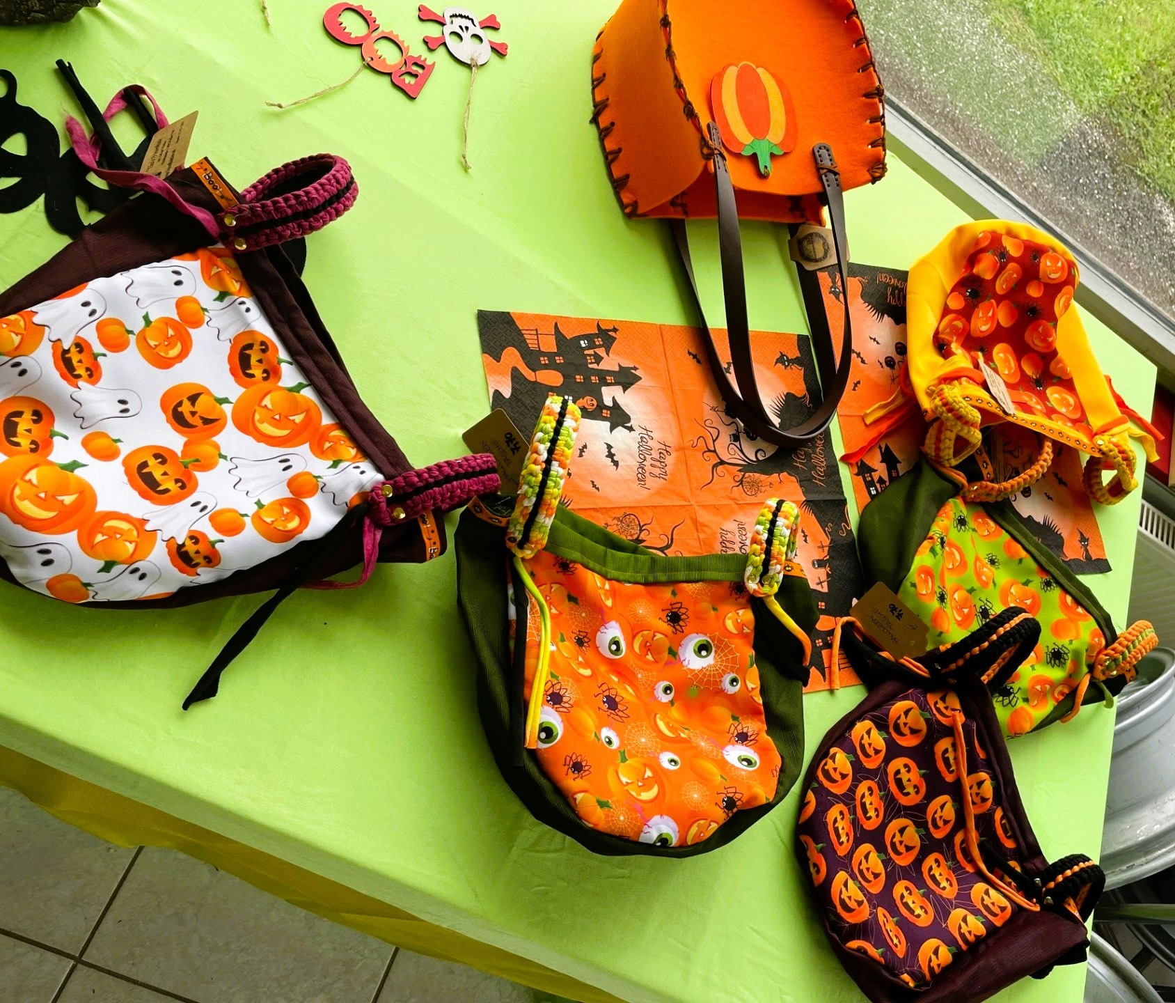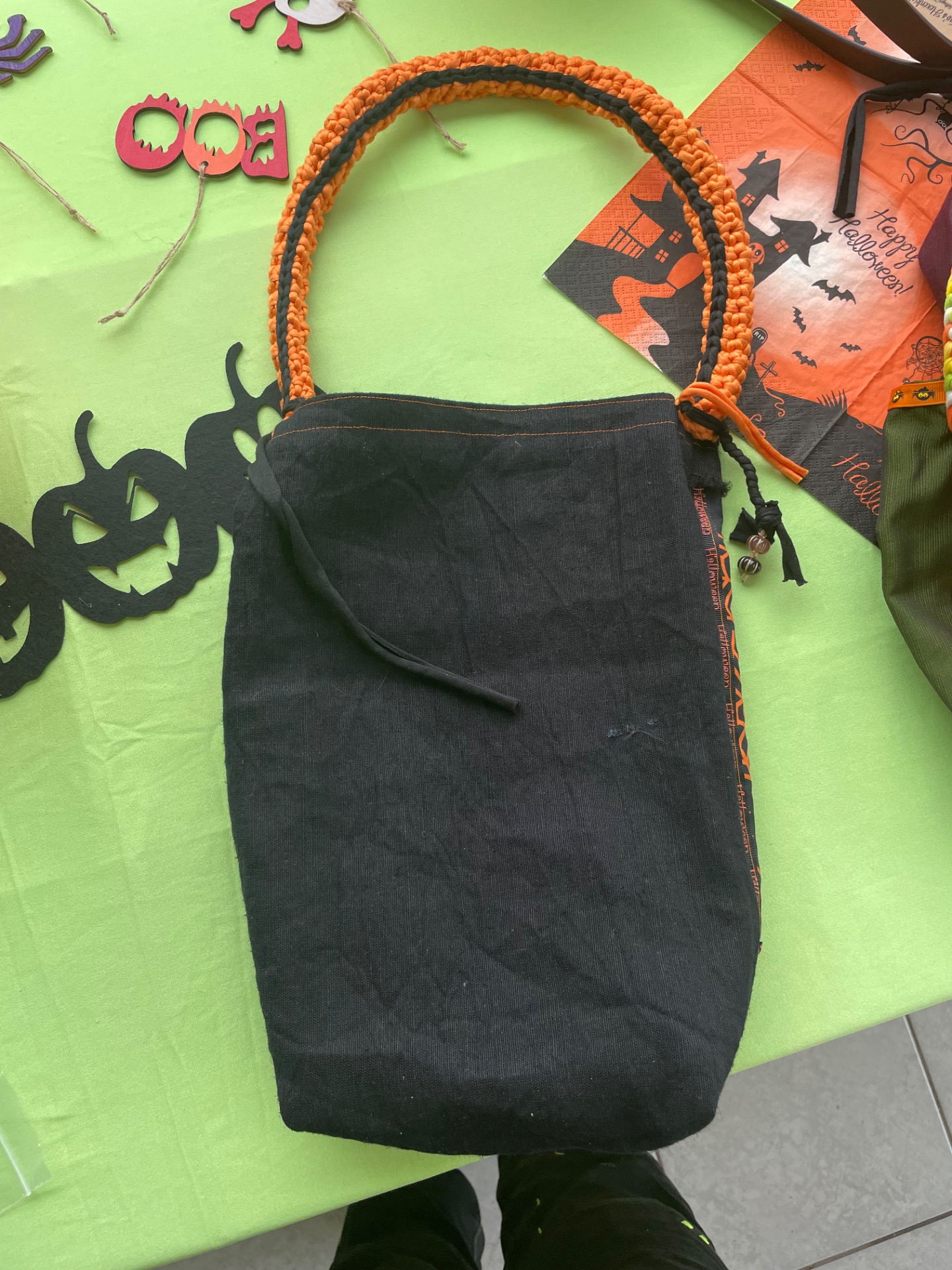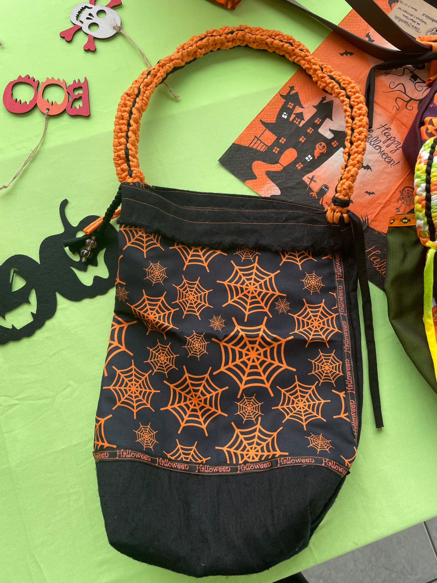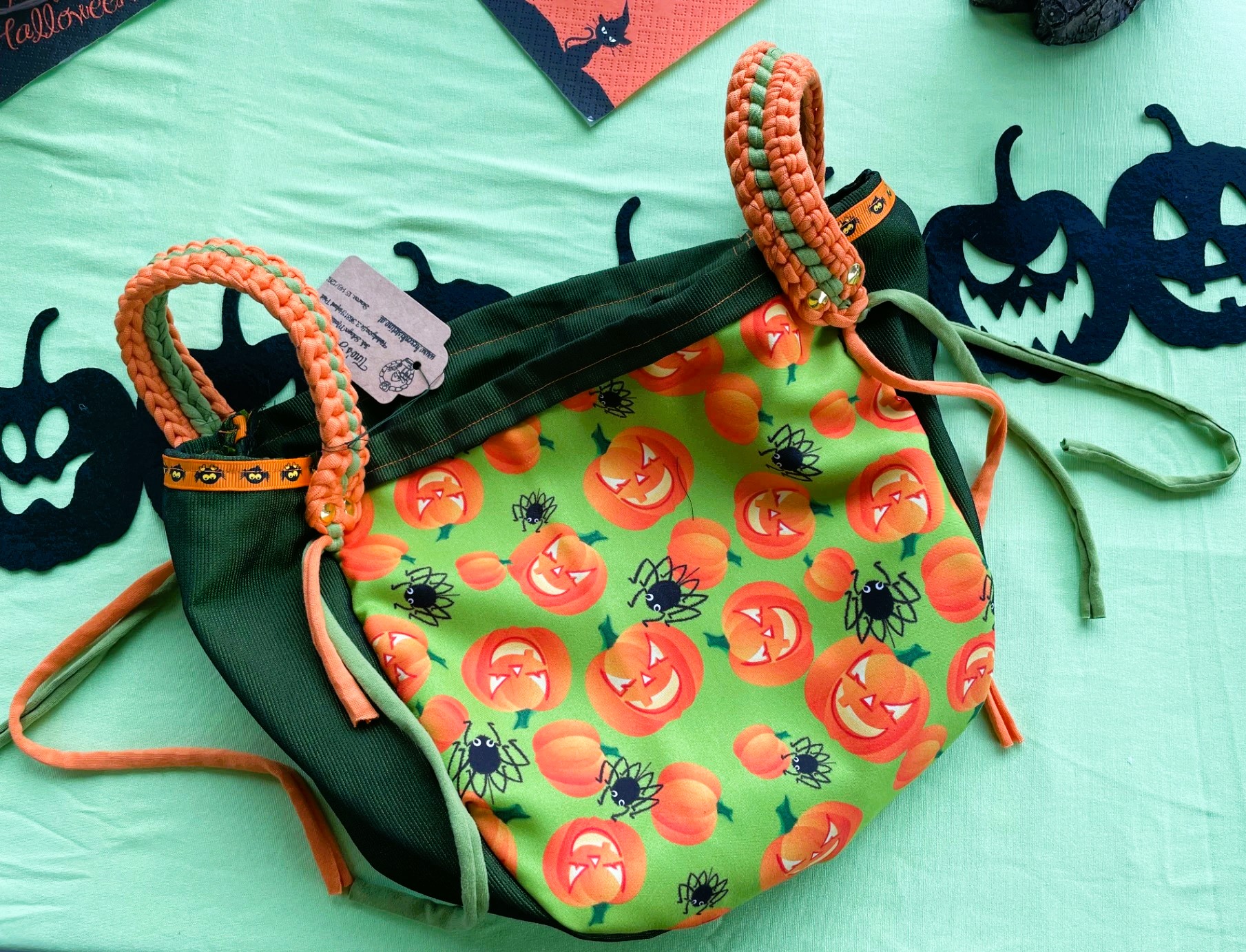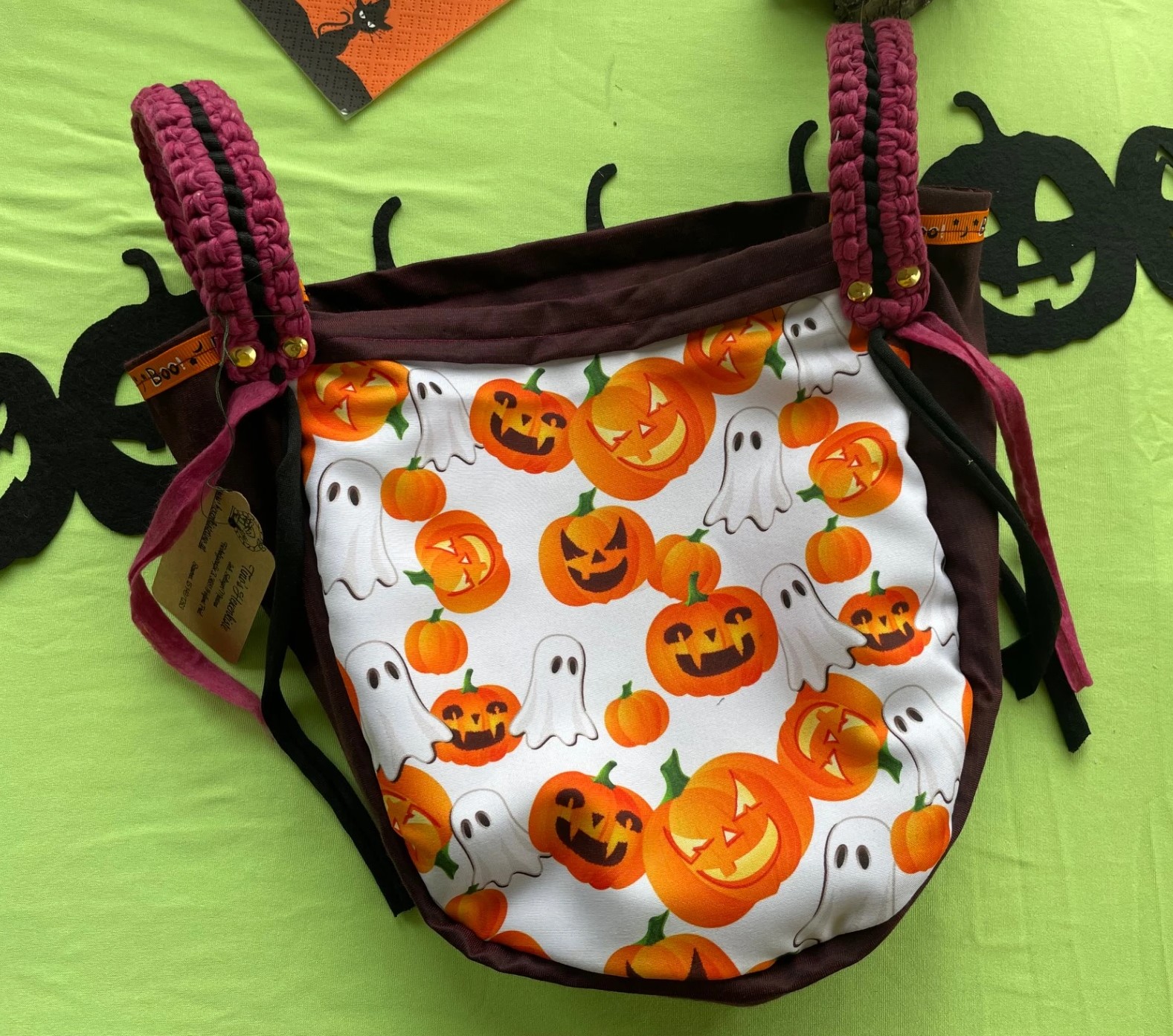 Diese tollen Taschen sind von mir Handgefertigt und aus Stoff. Die Trageriemen wurden aus Stoffgarn gehäkelt und somit ist dieser Blickfänger auch waschbar. Optimal für Süßigkeiten sammeln gehen oder als Einkaufstasche im Herbst ;)